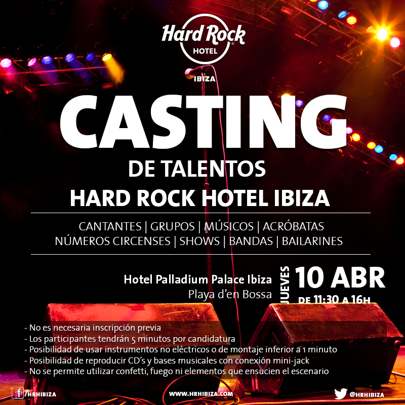 Thursday, 10th of April, from 11,30 till 16,00 there will be a “casting de talentos” for Hard rock hotel Ibiza!
