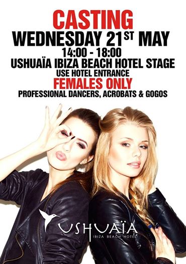 Ushuaia Ibiza announced the female casting next 21st of May from 14,00 till 18,00.. are required professional dancers, acrobats and gogos!