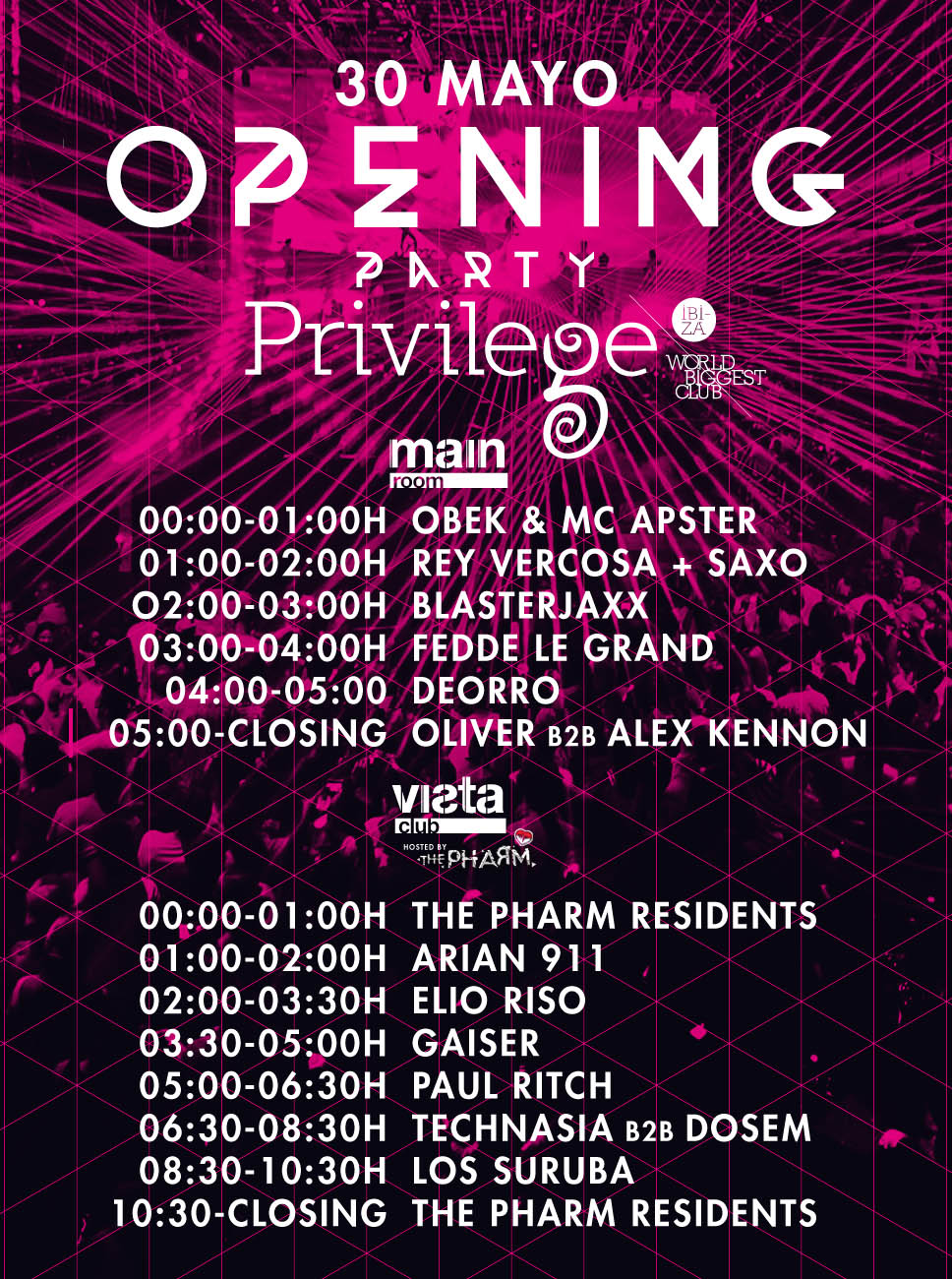 Here you have the set times for the Privilege Ibiza Opening party, a big event with a great line up that includes Fedde Le Grand, Elio Riso, Gaiser, Paul Ritch, Technasia b2b Dosem, Los Suruba, Alex Kennon b2b Oliver, Deorro and many more!