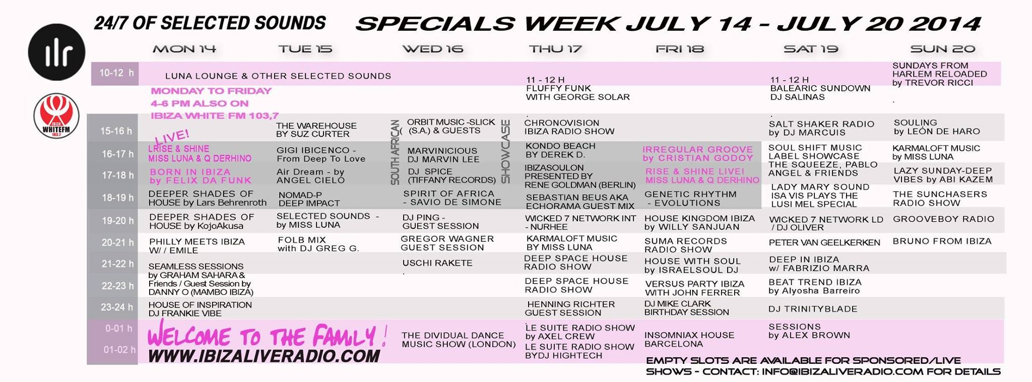 Ibiza live radio! the specials of the week..with Miss Luna, Felix Da Funk, John Ferrer, Rene Goldman, and many more!