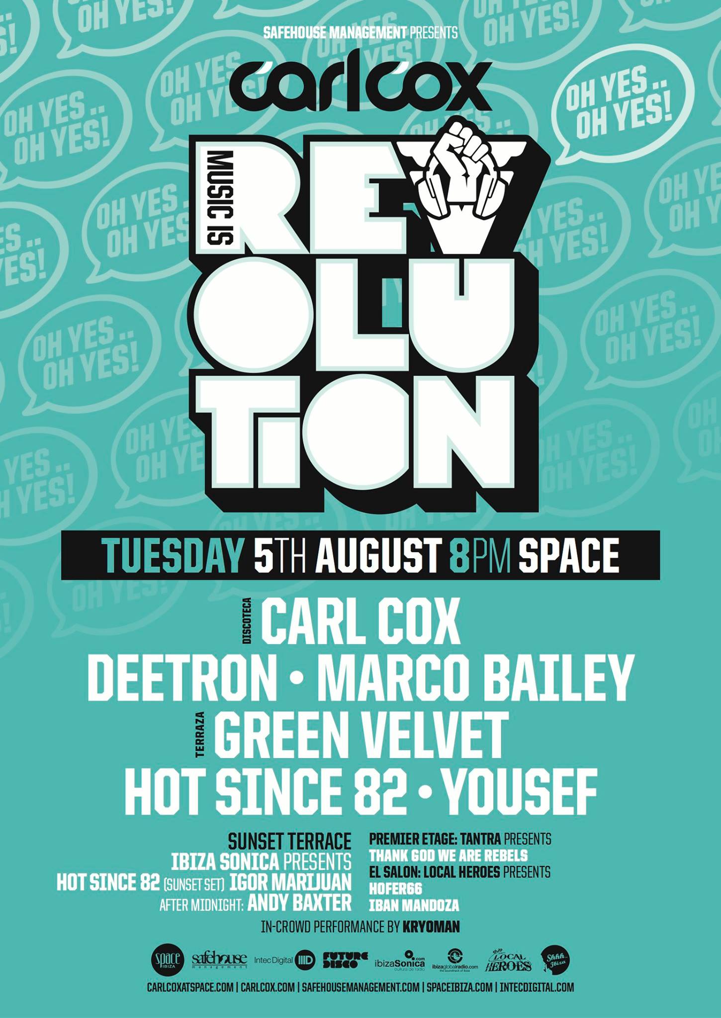 Tuesday, Space Ibiza presents: Carl Cox, Deetron, Marco Bailey, Green velvet, Hot Since 82, Yousef and Andy Baxter!