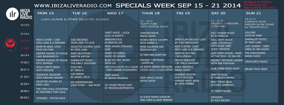 Ibiza by night also this week is media partner of Ibiza live radio! As all the weeks we publish the radio’s programs with all the specials for next days at http://www.ibizaliveradio.com ! Ibiza live radio is the web radio station based in Ibiza that has been founded and it’s directed by Miss Luna!! This week the line up will include as usual djs from worldwide and great friends of our community, as Miss Luna, René Goldman, Felix Da Funk (with his show “Born in Ibiza”) John Ferrer (with the show “Versus party Ibiza”), Fabrizio Marra, QDehrino, “an underground love story”, Wicked 7 Network Thursday with Hofer 66 and Saturday Wicked 7 Network London with Seb Fontaine and live streamings !!!!!!!!!  And stay tuned..because of next week will return Ibiza by night radio show with a new great guest! And this is the poster with all the programs!