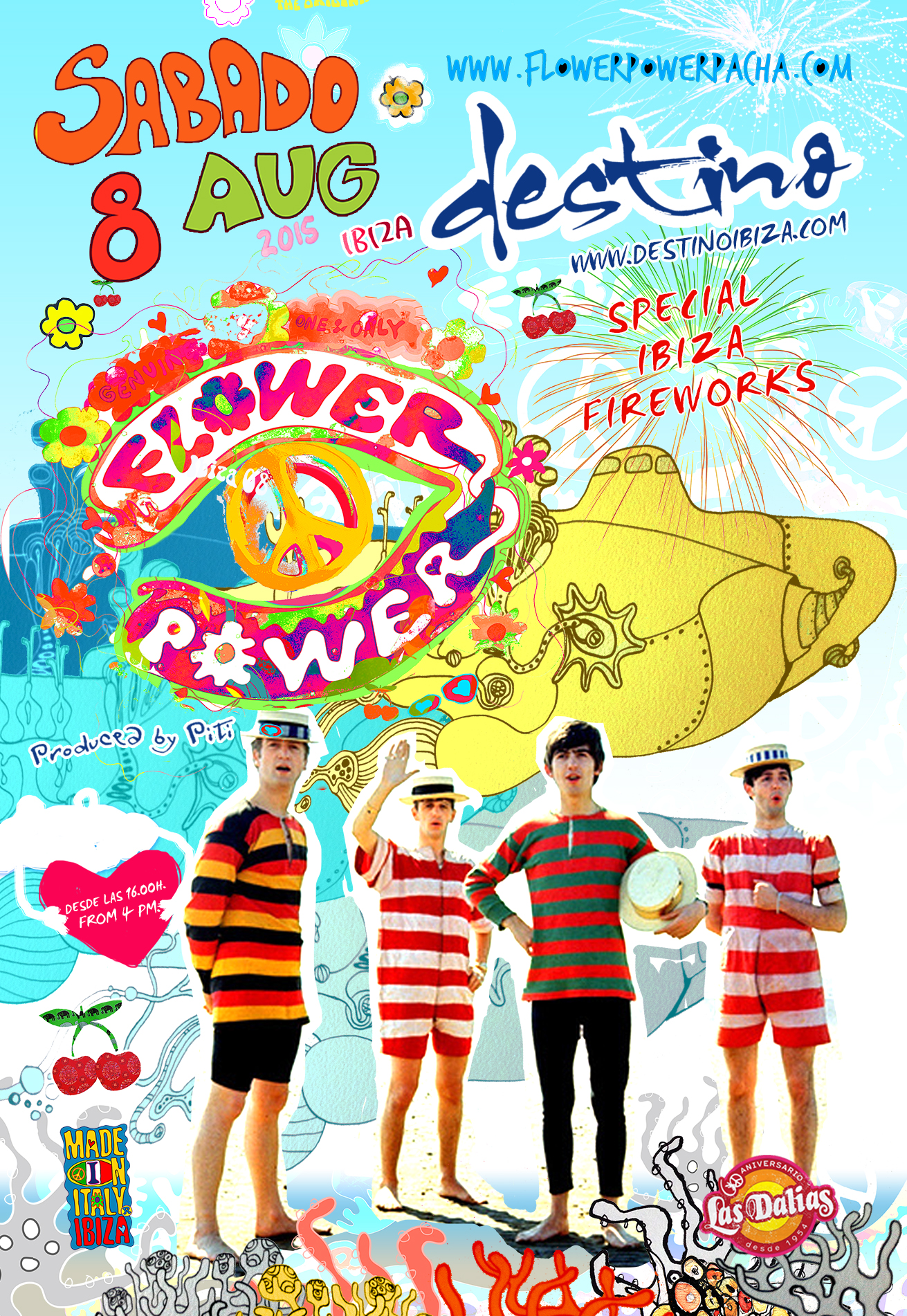 Next Saturday 8th of August, in the exclusive location of  Destino (Pacha Ibiza Resort), starting at 4 pm, will be celebrated a special edition of “Flower power”…and it will be possible to see the Fireworks! Flower power is one of the most famous Ibiza’s icons, and next Saturday  it will be possible to partecipate to a special event, with the music and choreography of sixties and seventies!