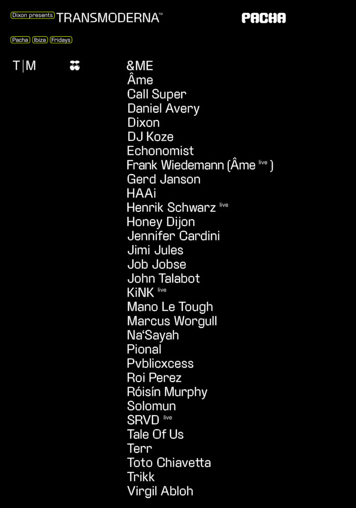 The organizers said:”In summer 2019, an experiment will convene in Ibiza that could change the ways clubbing is experienced. on 24th of may dixon will bring his new project transmoderna to pacha, returning every friday for 20 weeks. however transmoderna is more than just a residency. it is a navigation through global phenomena, in real life and in virtual reality. over the period of transmoderna’s instalment at pacha dixon will invite collaborators, conspirators and competitors to join him in order to: