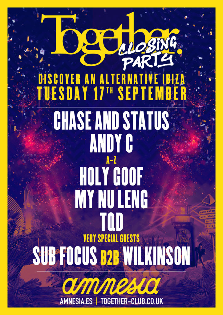 Together announced the Ibiza closing party with Chase & Status, Andy C, Sub Focus & Wilkinson and more! The event will take place at Amnesia Ibiza, September 17th.