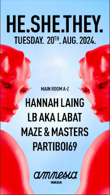 Tuesday, August 20th, Amnesia Ibiza (main room) presents HE.SHE.THEY., with Hannah Laing, LB Aka Labat & many more!