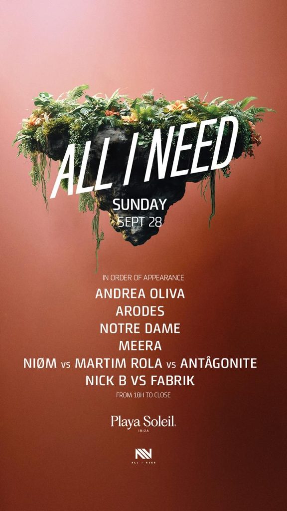 “All I Need” at Playa Soleil Ibiza presents Andrea Oliva, Arodes, Notre Dame, Meera, Nick B v/s Fabrik & many more!