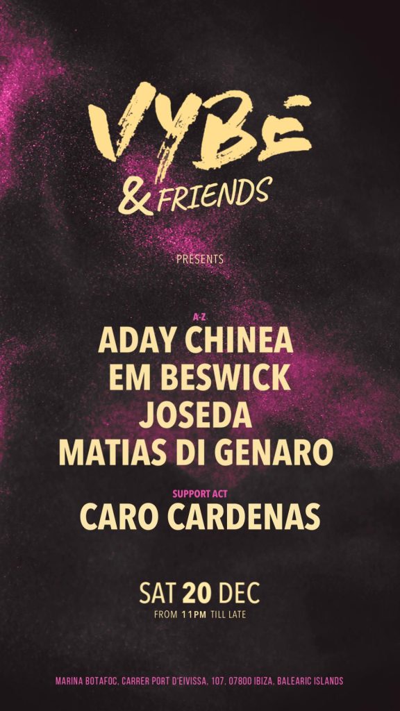 Vybe and friends hosts tonight December 20th, 2025 Aday Chinea, Joseda, Matias Di Genaro, Em Beswick plus a support act by Caro Cardenas.